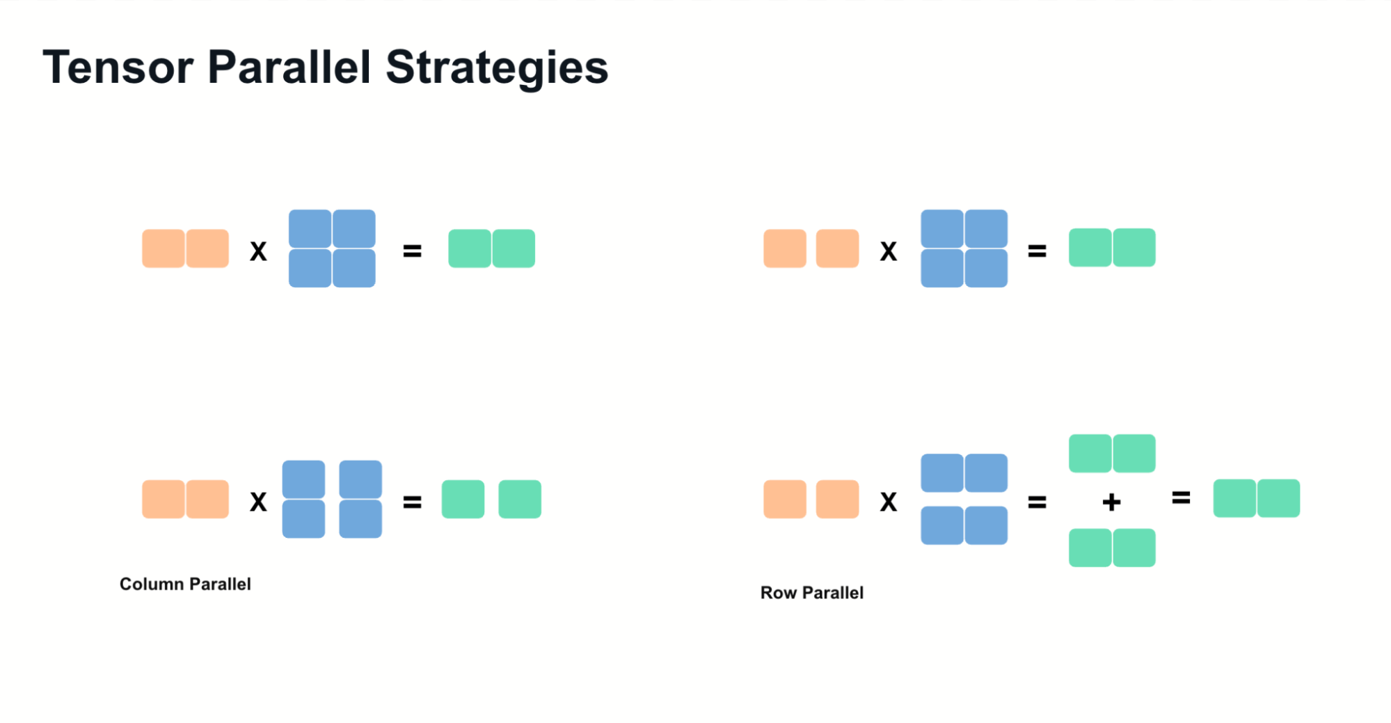 - Row Parallelism: Splitting matrices along rows, summing partial results post-computation.